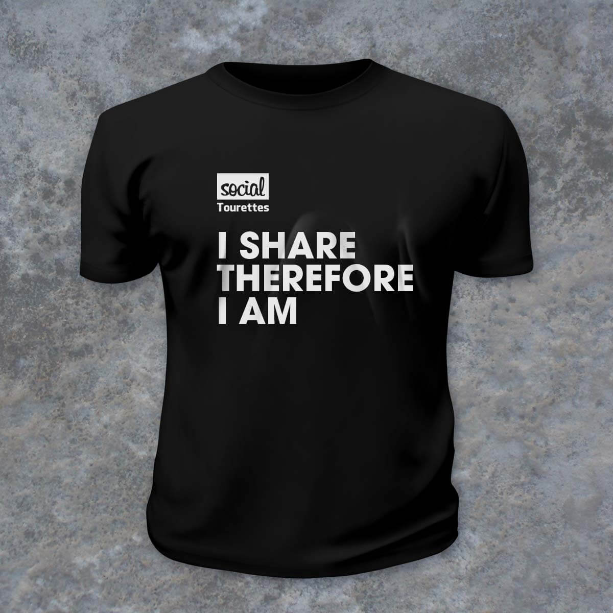 Social Tourettes signature brand “I Share Therefore I Am” T-Shirt